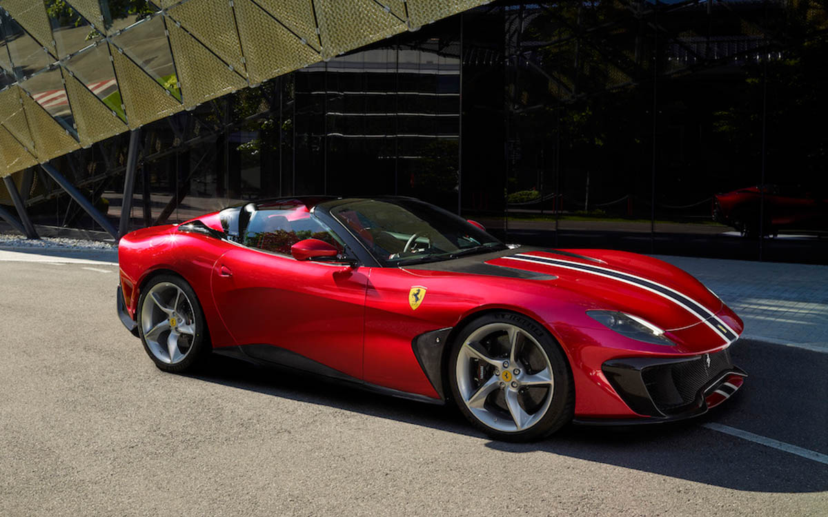 Sotto al cofano, pulsa quel magnifico 12 cilindri a “V” (viva Dio privo di elementi elettrici), capace di 800 CV, con una coppia di 718 Nm disponibile, all’80%, già a 3.500 giri e parliamo di un motore che arriva a 8.900 giri. Il tutto è reso possibile, grazie anche ad un sistema d’iniezione, che spinge fino a 350 bar. Lo schema e la telaistica, sono gli stessi della 812, con motore montato anteriormente. Il cambio è l’F1 dual-clutch a 7 rapporti, particolarmente rapido, soprattutto se messo in modalità sportiva. Anche l’elettronica è aggiornata per offrire le massime prestazioni e la massima libertà di gestione al pilota. La livrea esterna è realizzata in un esclusivo “Rosso Passionale”, un triplo strato sportivizzato da strisce longitudinali bianche e blu, ispirate alla Ferrari 410 S del 1955. Altro elemento di design, che strizza l’occhio agli anni ‘60, è rappresentato dalle due, chiamiamole, gobbe, posizionate dietro l’abitacolo, che dovrebbero fungere da strutture di protezione. Internamente, dominano rivestimenti in l’Alcantara®, nella stessa colorazione Rosso Passionale degli esterni, che genera un bel contrasto, con il bianco ed il blu, di altri elementi, come il tunnel centrale. Massiccio l’utilizzo di elementi in fibra di carbonio, sia interni che esterni, come le prese d’areazione del cofano e le alette dei cerchi, ovviamente, anche questi specifici per l’auto.